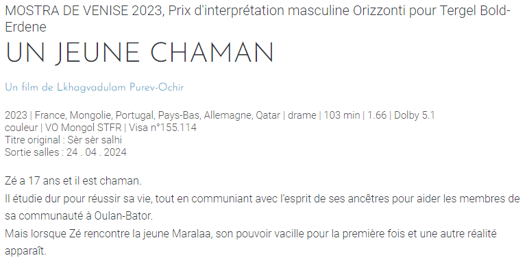 Projection du film UN JEUNE CHAMAN + conférence sur le chamanisme avec Franck Conti (shaman – Mongolie) + goûter : gen maï.